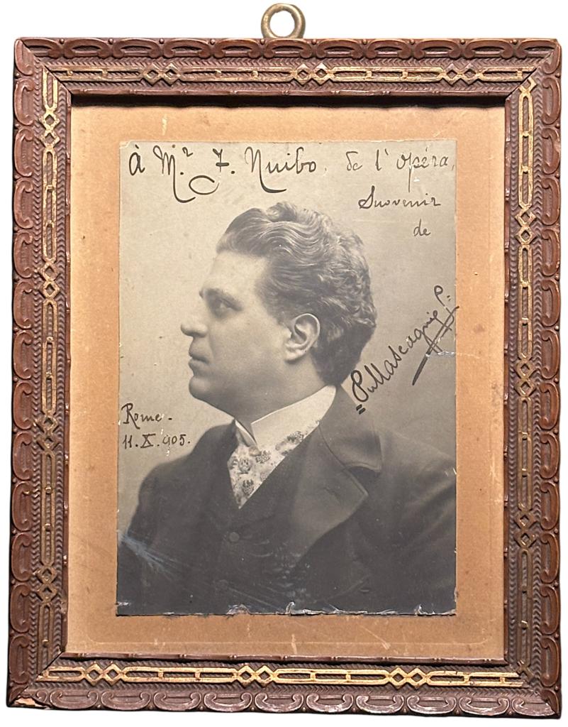 Condizioni: la fotografia nella parte inferiore presenta alcuni difetti. Piccola mancanza anche nell'angolo inferiore della cornice. Bellissima fotografia incorniciata ai sali d’argento raffigurante Pietro Mascagni, fu uno dei maggiori compositori italiani del periodo verista. Raggiunse fama mondiale con la sua prima opera, Cavalleria Rusticana (1890), che rivoluzionò il teatro lirico per intensità drammatica e realismo musicale. Autore di numerose partiture – tra cui L’amico Fritz, Iris, Isabeau e Nerone – diresse orchestre in tutto il mondo, diventando figura di spicco della cultura musicale italiana tra Otto e Novecento.Fotografia con dedica interamente autografa e firmata al tenore Francisco Nuibo, uno dei suoi interpreti della Cavalleria Rusticana, redatta a Roma l’11 ottobre 1905: "Souvenir de l'Opéra".Il riferimento all’“Opéra” allude probabilmente alla rappresentazione parigina di Cavalleria Rusticana, che consacrò l’opera al successo internazionale, portando Mascagni tra i protagonisti della scena lirica europea.
