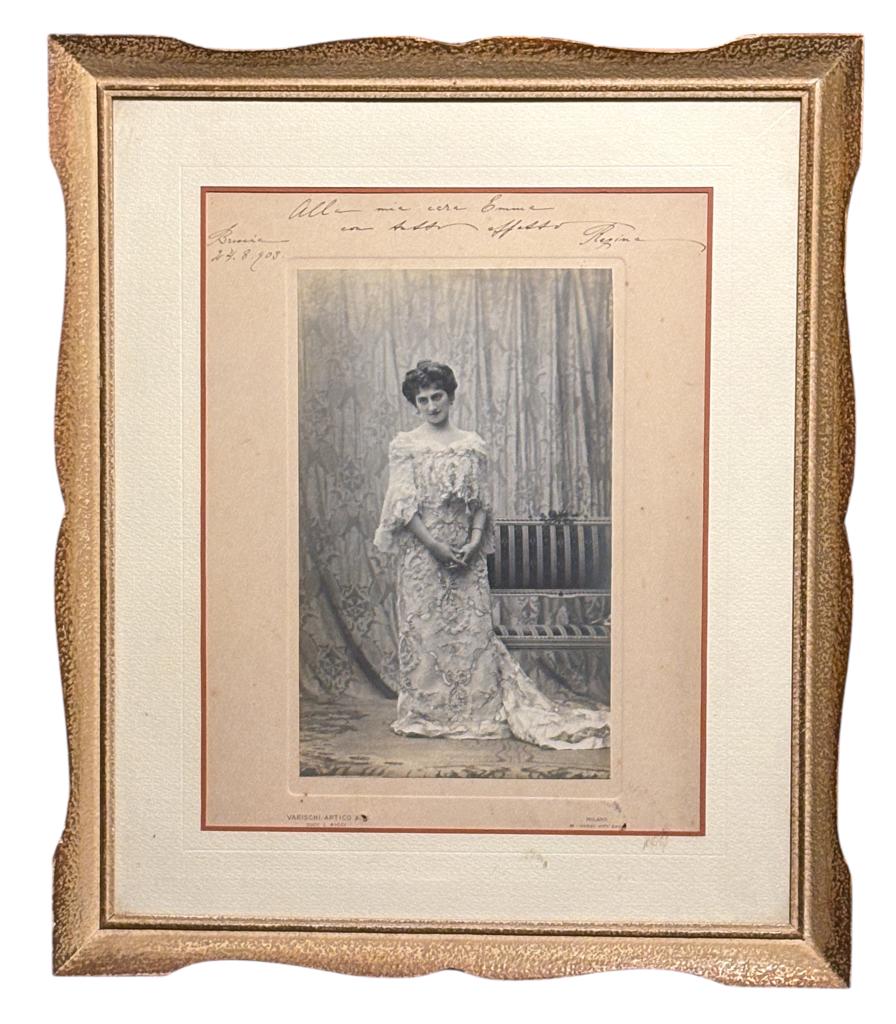 Bellissima fotografia d’epoca dei fotografi Varischi & Artico di Milano, raffigurante il celebre soprano Regina Pacini. Dopo il debutto nel 1888, si affermò nei teatri d’Italia e d’Europa, celebre per le interpretazioni di Lucia di Lammermoor e La Sonnambula. Ritiratasi dalle scene nel 1907, sposò il futuro presidente portoghese António de Almeida, divenendo figura di spicco anche nella vita culturale e politica lusitana.Fotografia che ritrae la Pacini in abiti di scena, con dedica interamente autografa e firmata: "Alla mia cara Emma con tutto affetto Regina", datata Brescia, 24 agosto 1903.Fotografia finemente incorniciata. Dimensioni cornice: 41 x 35 cm