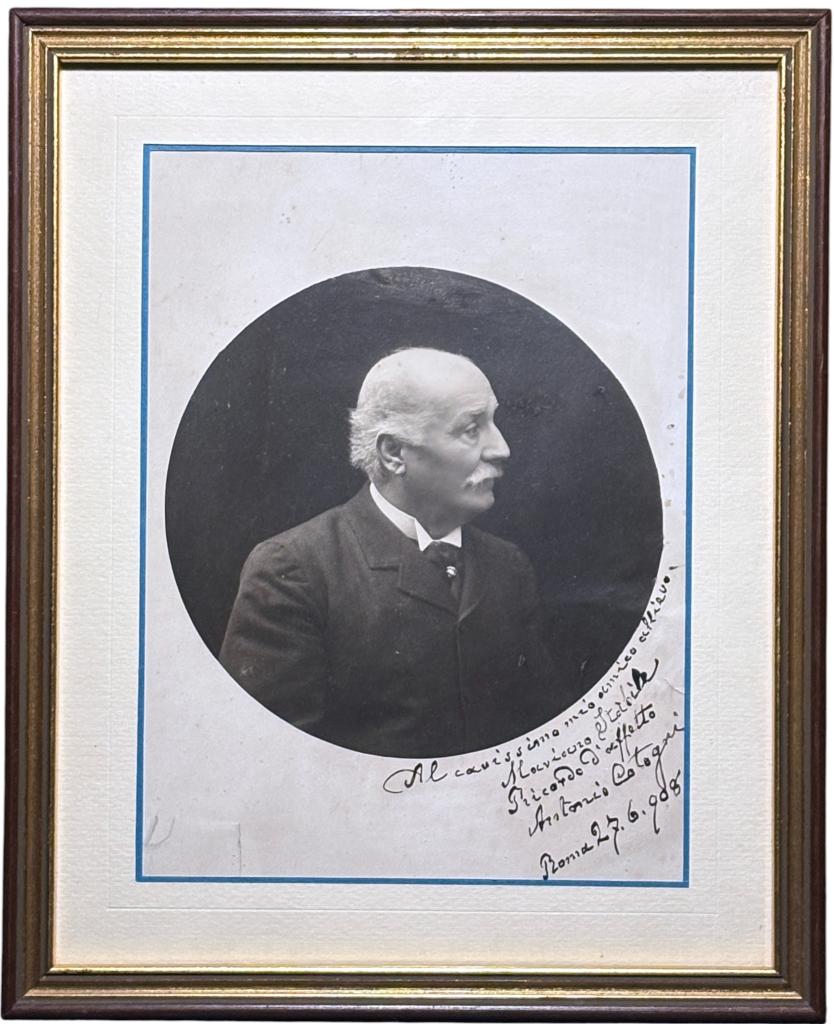 Splendida fotografia con dedica interamente autografa e firmata di Antonio Cotogni celebre baritono italiano dell’Ottocento. Interprete amatissimo di Verdi e Donizetti, calcò i maggiori palcoscenici europei prima di dedicarsi all’insegnamento all’Accademia di Santa Cecilia di Roma. Tra i suoi allievi si ricordano Mattia Battistini e Titta Ruffo. La sua scuola vocale, basata su eleganza, chiarezza e intensità espressiva, influenzò generazioni di cantanti.La dedica, vergata a penna con elegante calligrafia, è indirizzata al suo allievo Stabile, accompagnata da parole di sincero affetto e riconoscenza e datata Roma, 27 Giugno 1908. L’immagine, di raffinata qualità fotografica, ritrae il Maestro in età avanzata, con lo sguardo sereno e la compostezza nobile che riflettono l’autorevolezza di una carriera straordinaria. Fotografia finemente incorniciata. Dimensioni cornice: 32,5 x 26,5 cm
