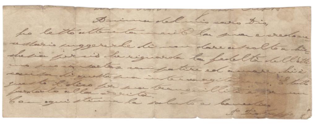 Risposta interamente autografa e firmata di San Pio da Pietrelcina, indirizzata a una "moglie" che gli aveva scritto in sofferenza, temendo l’infedeltà del marito. Padre Pio rassicura la devota usando queste parole: "Anima del mio caro Dio, ho letto ultimamente la sua e credo necessario suggerirle di non dare ascolto a chicchessia per ciò che riguarda la fedeltà dell'ottimo suo consorte e compatire ed amare chi è causa di questa sua agitazione. E tutto questo lo dico per sua tranquillità e per non far torto alla verità. Con ogni stima la saluto e benedico P. Pio Capp." Per tutela della privacy, la parte superiore con i riferimenti personali è stata intenzionalmente rimossa; resta il corpo della risposta, dove Padre Pio offre parole di vicinanza, consiglio spirituale e benedizione. Trattasi di un incontro tra la mano di un Santo e la ferita riservata di una famiglia. Questo frammento interamente autografo di San Pio da Pietrelcina è raro e intimo. Non è una formula di rito, non è un biglietto protocollare: è una risposta personale, cucita su una coscienza concreta, scritta per sciogliere il nodo del dubbio e riportare pace.Prezioso frammento interamente autografo e firmato di San Pio da Pietrelcina celebre frate cappuccino vissuto a San Giovanni Rotondo dal 1916. Mistico e confessore instancabile, ricevette le stigmate nel 1918 e fondò la Casa Sollievo della Sofferenza (1956). Molto venerato già in vita, è stato proclamato Santo il 16 giugno 2002 da Giovanni Paolo II. La sua spiritualità unisce preghiera, sacrificio e carità concreta.Documento di eccezionale rarità, testimonianza diretta della vita spirituale e dell’attività epistolare di Padre Pio, tra le figure più venerate del Novecento.