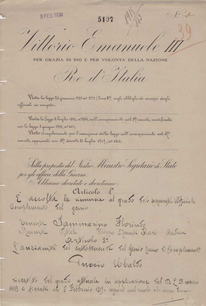 Il documento redatto a Roma il 31 gennaio 1924, decreta l’avanzamento di grado di vari ufficiali dell’Esercito Italiano, tra cui i tenenti Rammarino Florindo, Puccio Ubaldo e Carlini Giovanni Battista, in applicazione delle leggi militari postbelliche emanate dopo la Prima Guerra Mondiale.