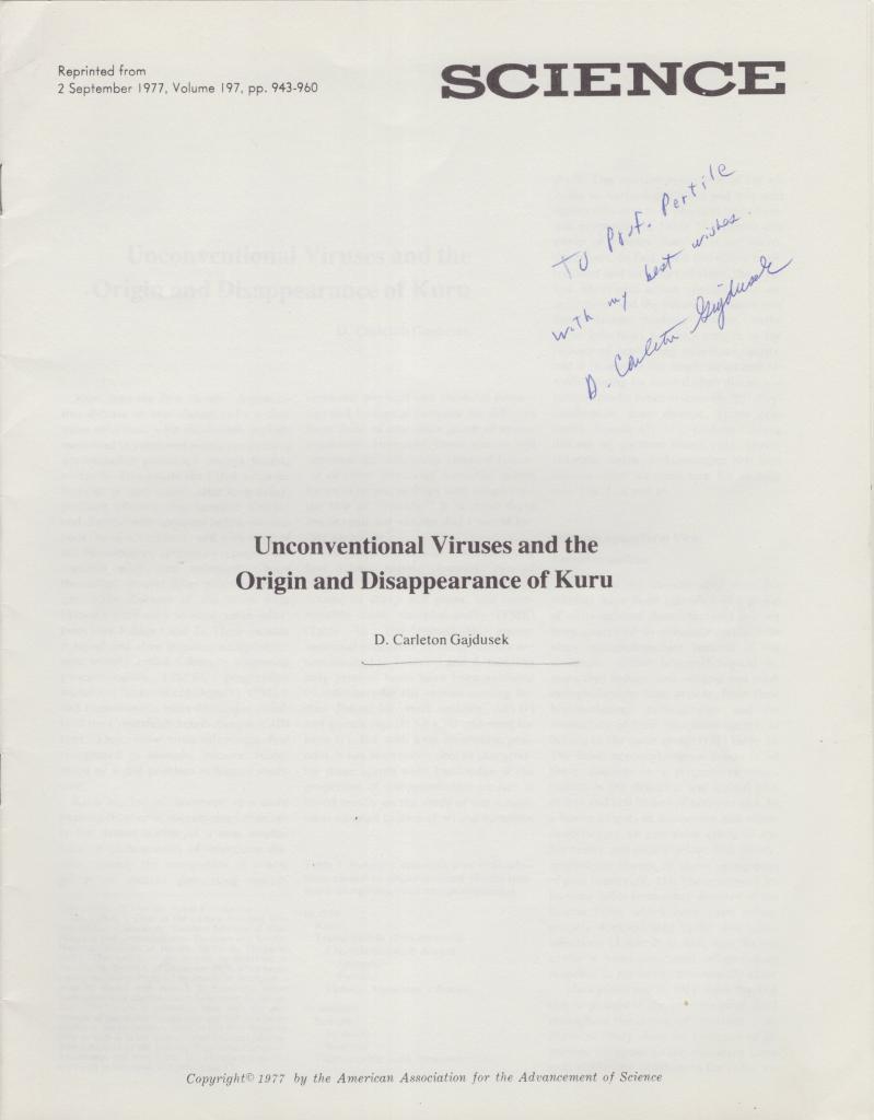 Estratto con dedica interamente autografa e firmata di Daniel Carleton Gajdusek noto medico, virologo e antropologo statunitense. Vinse il Premio Nobel per la Medicina nel 1976 per le sue ricerche sul morbo di Kuru, una malattia neurodegenerativa diffusa tra i Fore della Nuova Guinea, scoprendo che era trasmessa da agenti infettivi simili a prioni. Il suo lavoro aprì la strada alla comprensione di malattie come la BSE e il morbo di Creutzfeldt-Jakob. Membro del NIH, studiò anche la diffusione culturale delle infezioni nei popoli indigeni. Raro estratto dell’articolo “Unconventional Viruses and the Origin and Disappearance of Kuru”, pubblicato su Science nel 1977 e firmato da Daniel Carleton Gajdusek (1923–2008), Premio Nobel per la Medicina 1976. Pubblicato dalla American Association for the Advancement of Science (AAAS). Il saggio rappresenta uno dei contributi più importanti nella storia della virologia e della neurologia moderna: Gajdusek vi analizza i risultati delle sue ricerche sul morbo di Kuru, malattia neurodegenerativa riscontrata presso la popolazione Fore della Nuova Guinea. Nel testo, lo scienziato dimostra la natura infettiva e non convenzionale del morbo, anticipando i successivi studi sui prioni, che avrebbero rivoluzionato la comprensione delle encefalopatie spongiformi, come la BSE e il morbo di Creutzfeldt-Jakob. L’esemplare reca sul frontespizio una dedica autografa di Gajdusek: “To Prof. Pertile with my best wishes – D. Carleton Gajdusek”,