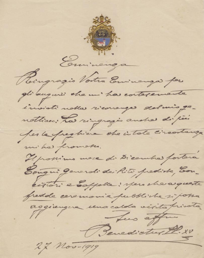 Il Pontefice vi ringrazia per gli auguri di compleanno, ricevuti in occasione della ricorrenza del 21 novembre, e ricambia con parole di sincera gratitudine. Successivamente, Benedetto XV fa riferimento anche al prossimo concistoro del 15 dicembre 1919, annunciando impegni e cerimonie pubbliche imminenti, e accenna a diversi eventi liturgici e istituzionali.