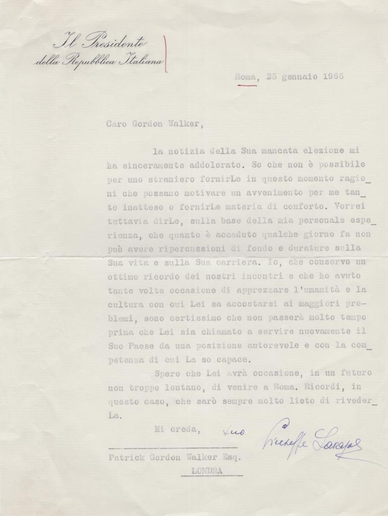 Il Presidente scrive con tono profondamente umano e rispettoso, esprimendo rammarico per la recente mancata elezione del destinatario, che aveva destato in lui sincera tristezza. Saragat manifesta stima personale e fiducia nella futura ripresa politica di Gordon Walker, ricordando con affetto i loro incontri precedenti e le occasioni di dialogo culturale e diplomatico. La lettera riflette il tono diplomatico e cordiale tipico della corrispondenza presidenziale dell’epoca, ma lascia trasparire anche un sincero sentimento di amicizia e solidarietà.