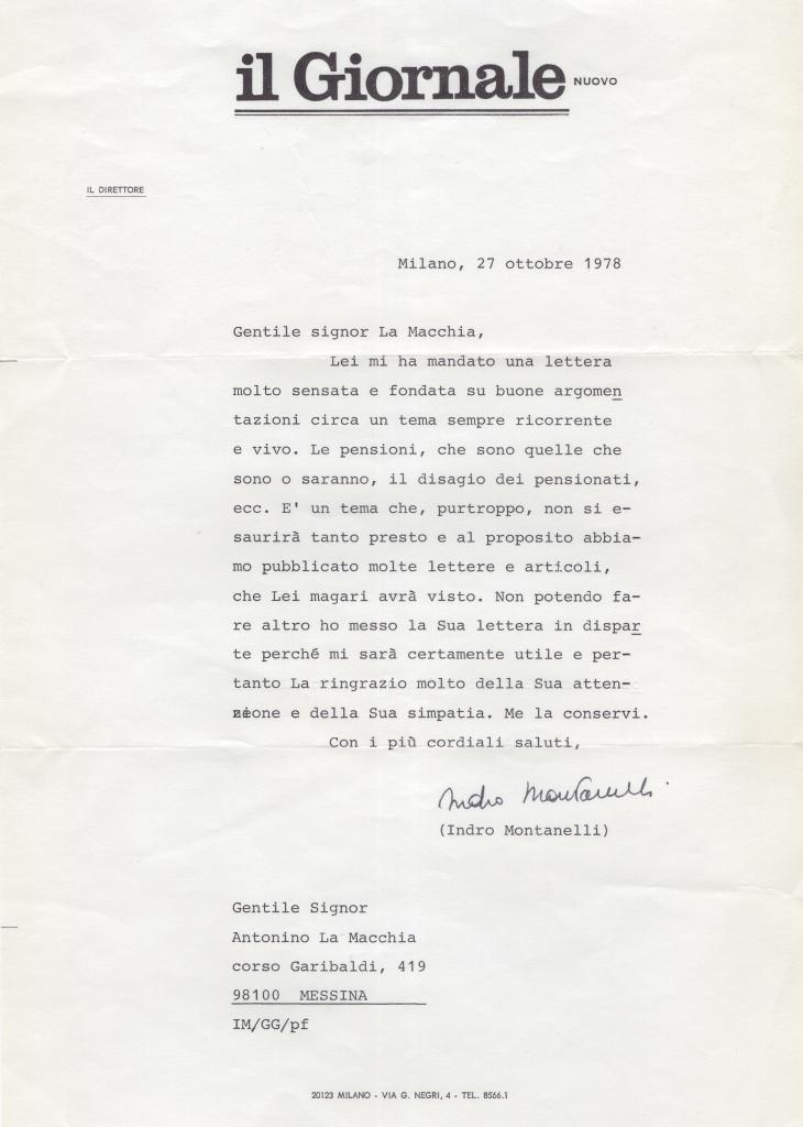 Lettera dattiloscritta con autografo di Indro Montanelli celebre giornalista, scrittore e storico, fu tra le figure più autorevoli del giornalismo italiano del Novecento. Fondatore de Il Giornale nel 1974, celebre per il suo stile limpido e indipendente, raccontò con lucidità e spirito critico oltre sessant’anni di storia italiana. Lettera su carta intestata del quotidiano “Il Giornale Nuovo”, con indicazione “Il Direttore” redatta a Milano il 27 Ottobre 1978 ed indirizzata ad Antonino La Macchia di Messina. Il giornalista risponde con tono cortese e riflessivo a una missiva del lettore sul tema delle pensioni e delle difficoltà dei pensionati, riconoscendone la fondatezza e l’attualità. Spiega di aver già pubblicato vari interventi sull’argomento e, pur non potendo ospitare il contributo ricevuto, ringrazia sentitamente per l’attenzione e la simpatia. Presente inoltre la busta d'invio della missiva.