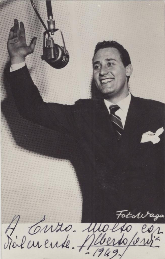Cartolina con dedica interamente autografa e firmata di Alberto Sordi celebre attore e regista italiano. Icona della commedia all’italiana, ha saputo raccontare con ironia e profondità i vizi e le virtù del popolo italiano. Splendida cartolina fotografica che ritrae Alberto Sordi in un momento di entusiasmo durante una registrazione in studio, davanti a un microfono. L’immagine, Foto Waga, cattura perfettamente l’energia e il carisma del giovane artista nei primi anni della sua carriera, quando già emergeva come una delle voci più riconoscibili della radio e del cinema italiani. Sul margine inferiore, si legge la dedica interamente autografa e firmata: “A Enzo. Molto cordialmente – Alberto Sordi, 1949” Nel 1949, Alberto Sordi è agli inizi della sua straordinaria carriera. Dopo l’esperienza alla radio come doppiatore (fu la voce italiana di Oliver Hardy) e attore comico nel varietà, comincia ad affermarsi nel cinema grazie ai primi ruoli di rilievo. In quegli anni lavora con registi come Mario Mattoli e Steno, gettando le basi del suo futuro successo nella commedia all’italiana. È il periodo della sua piena ascesa nel panorama artistico nazionale.
