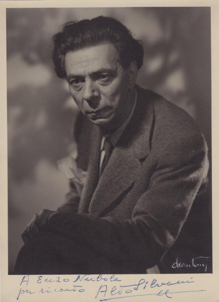 Fotografia con dedica interamente autografa e firmata di Aldo Silvani noto attore di grande talento, noto per la sua presenza scenica austera e profonda. Dopo una lunga carriera teatrale, passò al cinema partecipando a film diretti da registi come Fellini, Rossellini e De Sica. Interprete di personaggi intensi e autorevoli, seppe dare spessore e umanità a ogni ruolo, lasciando un segno duraturo nel panorama artistico italiano. Grande fotografia ai sali d'argento, scattata dal celebre fotografo De Antonis, che ritrae l’attore Aldo Silvani in un intenso ritratto in bianco e nero. Sul margine inferiore compare la dedica interamente autografa e firmata: “A Enzo Nubola per ricordo Aldo Silvani”.