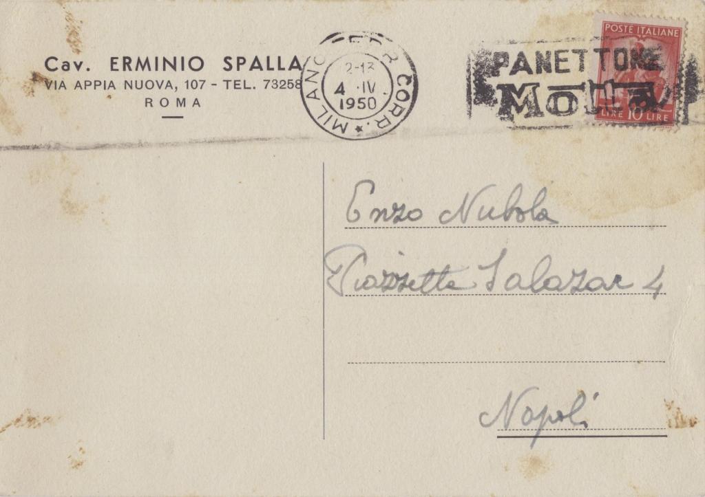 Cartolina con dedica interamente autografa e firmata di Erminio Spalla noto campione europeo dei pesi massimi tra il 1923 e il 1926, primo italiano a conquistare tale titolo. Terminata la carriera sportiva, si affermò come attore cinematografico e cantante lirico, lavorando con grandi registi e case di produzione internazionali. Figura carismatica, rimane un simbolo dell’Italia tra sport e arte. Cartolina d’epoca con dedica interamente autografa e firmata di Erminio Spalla, celebre pugile e attore italiano. La dedica, vergata a penna blu, recita: “Ad Enzo Nubola con viva cordiale e tenera amicizia – Erminio Spalla – Milano 2-4-1950”. Spalla oltre alla dedica ha manoscritto personalmente il destinatario e l'indirizzo sul retro.
