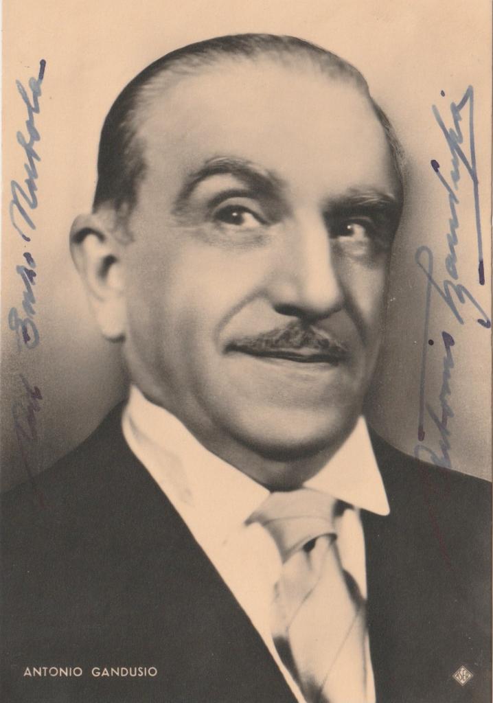 Fotografia con dedica interamente autografa e firmata di Antonio Gandusio, fu uno dei più raffinati interpreti del teatro leggero italiano. Amato per il suo stile brillante e per la naturale vena comica, passò con successo al cinema, recitando in numerosi film dagli anni ’30 ai primi ’50. Elegante fotografia ai sali d’argento, raffigurante il celebre attore teatrale e cinematografico Antonio Gandusio. Sui lati, a penna blu, compare la dedica interamente autografa e firmata: “Ad Enzo Nubola – Antonio Gandusio”.