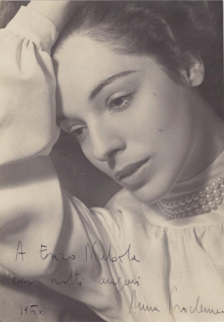 Fotografia con dedica interamente autografa e firmata di Anna Proclemer, fu protagonista assoluta della scena teatrale italiana del Novecento. Lavorò con i maggiori registi, tra cui Visconti, Strehler e Ronconi, distinguendosi per la sua voce inconfondibile e la presenza magnetica. Compagna di vita e d’arte di Giorgio Albertazzi, recitò anche per cinema e televisione. Elegante fotografia d’epoca in bianco e nero realizzata da Foto Barzacchi, con autografo e dedica originale di Anna Proclemer, una delle più intense interpreti del teatro e del cinema italiano. La dedica, datata 1950, recita: “A Enzo Nubola con molti auguri – Anna Proclemer”.