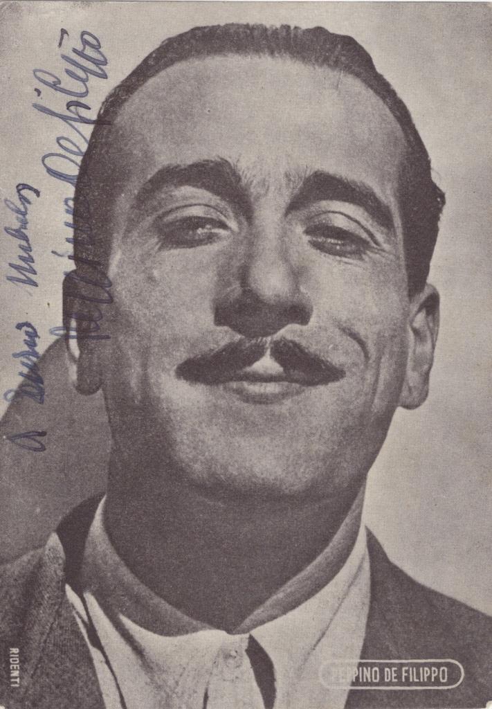 Fotografia con dedica autografa e firmata di Peppino De Filippo, è stato uno dei più amati attori e autori del teatro e del cinema italiani. Fratello di Eduardo e Titina, seppe fondere comicità e malinconia in personaggi indimenticabili. Celebre la sua collaborazione con Totò e il successo teatrale di Non è vero... ma ci credo. Maestro dell’umorismo intelligente e dell’arte napoletana. Splendida fotografia d’epoca con dedica interamente autografa e firmata di Peppino De Filippo, che ritrae il grande attore e commediografo napoletano in un ritratto sorridente, tipico della sua verve ironica: "A Enzo Nubola Peppino De Filippo".