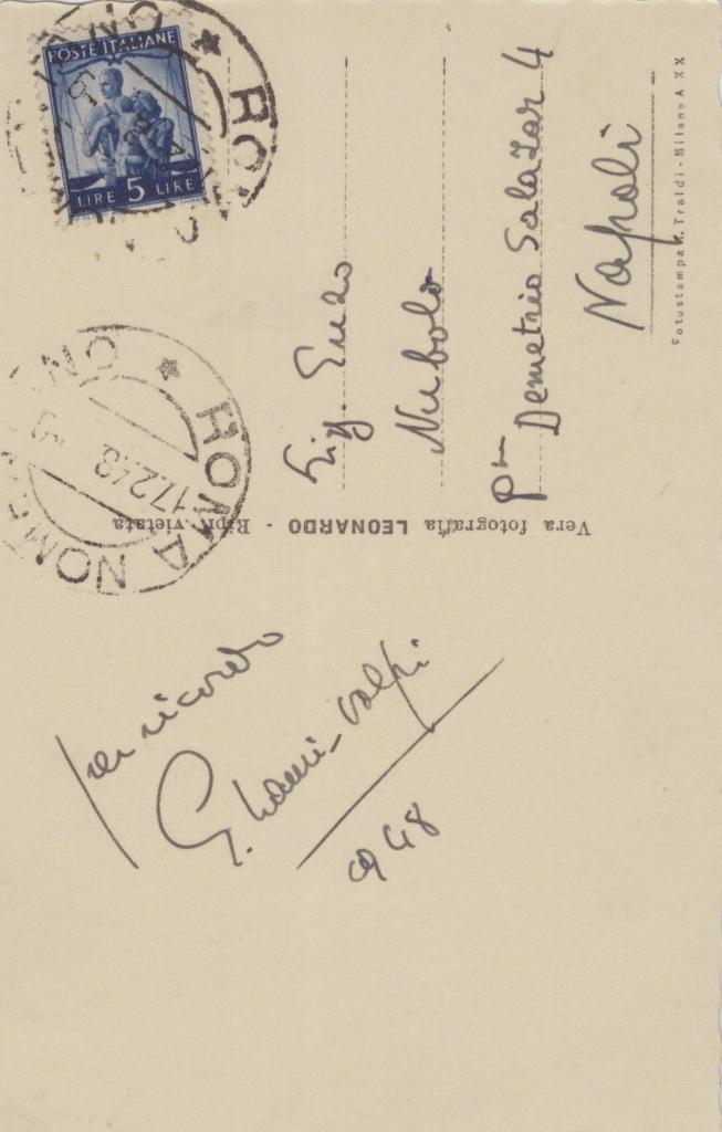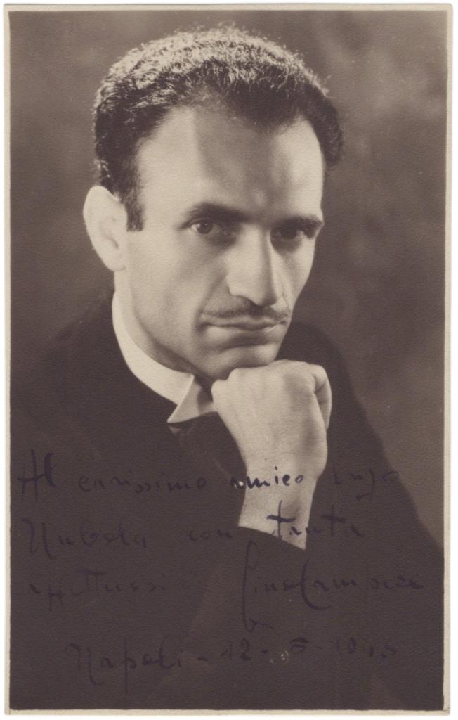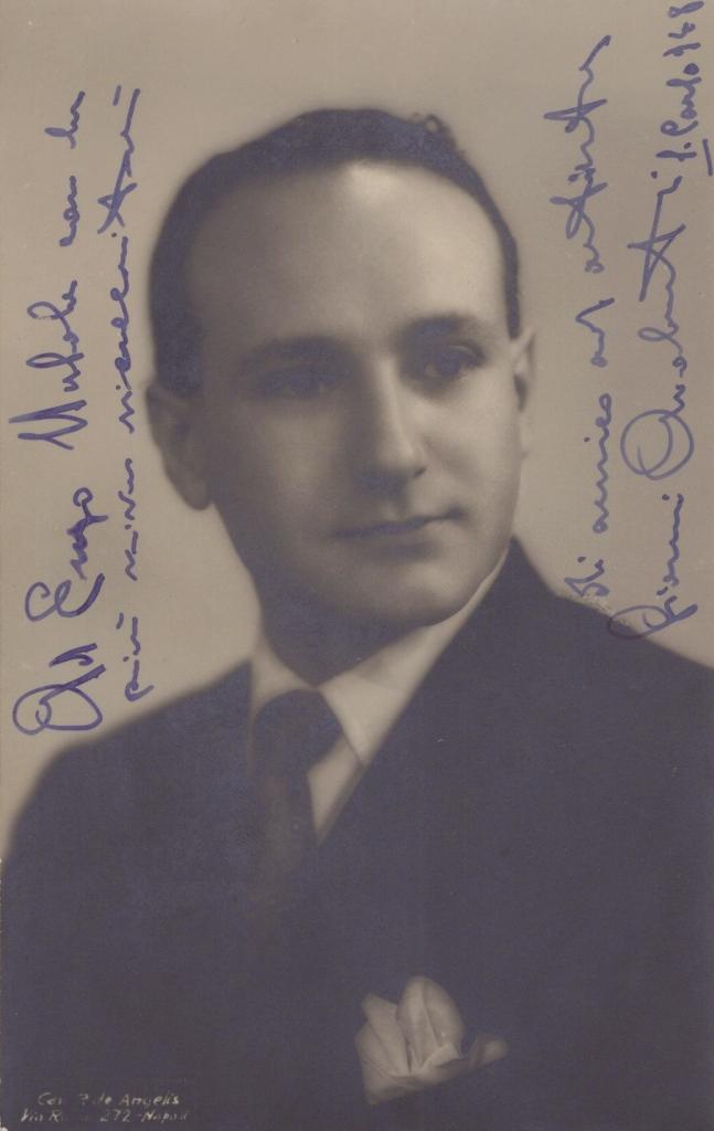 Cartolina fotografica con dedica autografa e firmata di Giacomo Lauri-Volpi celebre tenore italiano. Protagonista dei più grandi teatri del mondo grazie alla sua voce limpida e potente. La sua carriera, costellata di successi internazionali, lo rese un simbolo del belcanto. Splendida cartolina fotografica ai sali d'argento con nota manoscritta e firmata del tenore Giacomo Lauri-Volpi, inviata da Roma a Napoli al Sig. Enzo Nubola con datazione: "per ricordo G. Lauri-Volpi 1948".
