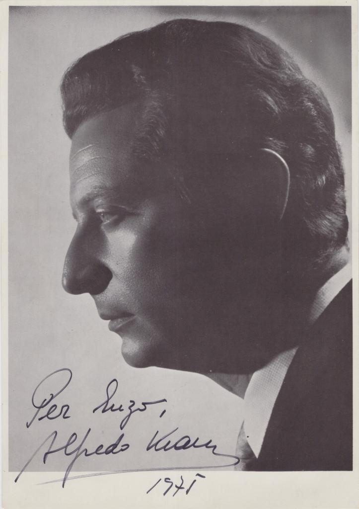 Fotografia di grandi dimensioni con dedica autografa e firmata di Alfredo Kraus considerato uno dei più illustri tenori del Novecento. Si distinse per il controllo tecnico, lo stile impeccabile e il repertorio raffinato, dominando le scene dei principali teatri del mondo, dalla Scala al Met. Bellissima fotografia d’epoca raffigurante il celebre tenore Alfredo Kraus in un intenso ritratto di profilo. Sul margine inferiore, in elegante inchiostro nero, dedica interamente autografa e firmata: “Per Enzo, Alfredo Kraus 1975”. ChatGPT ha detto: