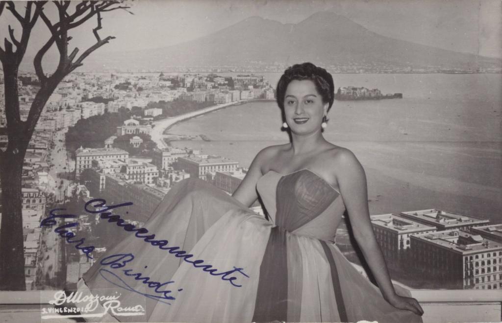 Autografo di Clara Bindi celebre attrice e cantante italiana, tra le interpreti più autentiche della tradizione napoletana. Dopo gli esordi come cantante radiofonica, raggiunse grande popolarità nel cinema e nel teatro, lavorando accanto a Totò, Eduardo De Filippo e Nino Taranto. La sua voce calda e il suo stile elegante l’hanno resa una figura amatissima dello spettacolo italiano del dopoguerra. Splendida cartolina fotografica d’epoca raffigurante la celebre attrice, ritratta in un’elegante posa davanti a un magnifico panorama di Napoli, con il Vesuvio sullo sfondo. Fotografia realizzata dallo studio D. Mozzoni, Roma, noto per i suoi ritratti d’artista. Sul margine inferiore, presente la dedica firmata redatta con inchiostro blu: “Sinceramente, Clara Bindi”. Un’immagine di grande fascino che unisce il sorriso radioso della Bindi al paesaggio iconico della sua Napoli, simbolo dell’autenticità della tradizione napoletana.