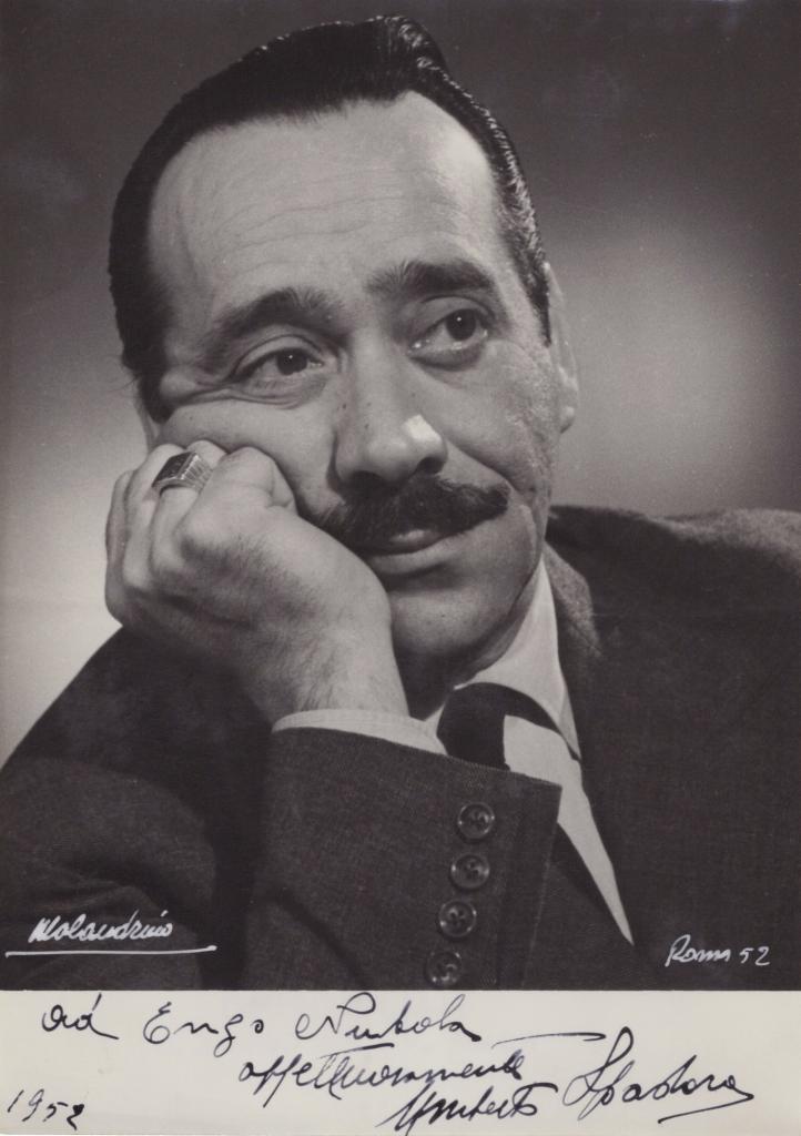 Dedica interamente autografa e firmata di Umberto Spadaro celebre attore di origini siciliane, fu interprete di grande intensità, attivo nel teatro, nel cinema e nella televisione. Collaborò con registi come Luchino Visconti e Roberto Rossellini, distinguendosi per la sua recitazione autentica e vibrante. Splendida fotografia ai sali d'argento realizzata dallo studio Malandrino di Roma, raffigurante il grande attore Umberto Spadaro, caratterizzato da una profonda espressività. Sul margine inferiore, in elegante inchiostro nero, dedica interamente autografa e firmata: “Ad Enzo Nubola affettuosamente Umberto Spadaro – 1952”.ChatGPT ha detto: