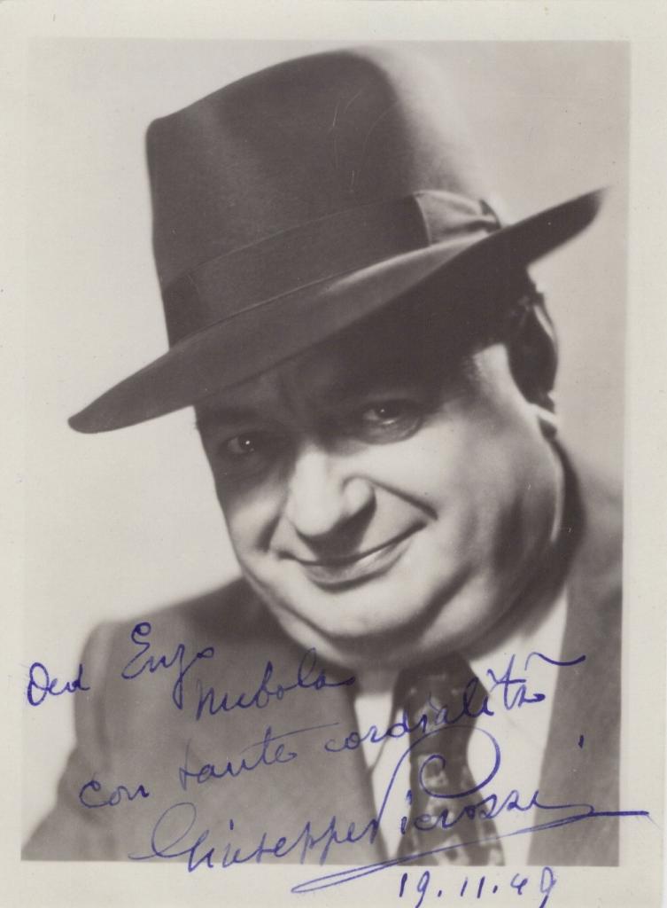 Dedica interamente autografa e firmata di Giuseppe Pierozzi celebre attore comico e caratterista italiano, tra i più popolari interpreti del teatro brillante e del cinema dei primi decenni del Novecento. Lavorò con grandi registi come Mario Mattoli e interpretò ruoli di spalla accanto a Totò e Macario, distinguendosi per ironia toscana e naturale verve scenica. Splendida fotografia d’epoca raffigurante l’attore e caratterista Giuseppe Pierozzi, volto amatissimo del teatro comico e del cinema italiano della prima metà del Novecento. La fotografia, di grande eleganza e naturalezza, lo ritrae con il suo tipico sorriso ironico e il cappello inclinato, simbolo del suo stile arguto e popolare. Sul margine inferiore, in inchiostro blu, si legge la dedica interamente autografa e firmata: “A Enzo Nubola con tante cordialità – Giuseppe Pierozzi – 19/11/49”.