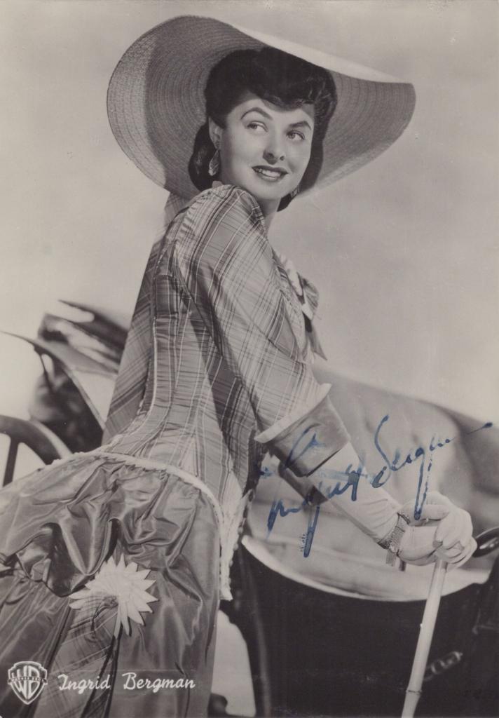 Autografo di Ingrid Bergman celebre attrice svedese, vinse tre Oscar e lavorò con maestri come Hitchcock, Rossellini e Cukor. Indimenticabile in Casablanca, Anastasia e Notorious, rimane un’icona assoluta del cinema mondiale. Splendida cartolina fotografica d’epoca Warner Bros., raffigurante Ingrid Bergman, una delle più grandi attrici della storia del cinema, in una posa elegante e raffinata. La Bergman, con il suo inconfondibile fascino nordico e la sua grazia senza tempo, è ritratta con ampio cappello e abito d’epoca. Sul fronte, si trova l'autografo dell’attrice, vergata con tratto deciso in inchiostro blu. Scatto probabilmente estrapolato dal film "Saratoga Trunk (1945)" con Ingrid Bergman e Gary Cooper, prodotto da Warner Bros.