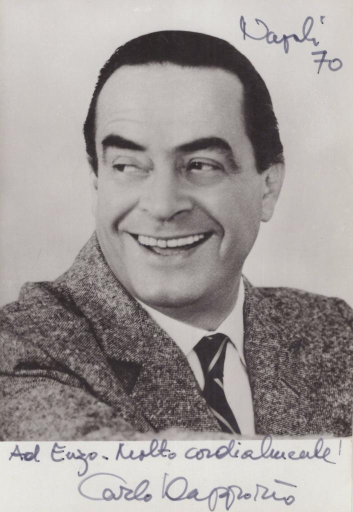 Autografo di Carlo Dapporto celebre attore e comico italiano, simbolo del teatro di rivista e del cinema brillante del dopoguerra. Con il suo umorismo elegante e popolare, conquistò il pubblico in teatro, radio, cinema e televisione, diventando una delle figure più rappresentative dello spettacolo italiano degli anni ’50 e ’60. Splendida fotografia d’epoca che ritrae Carlo Dapporto in un ritratto sorridente e spontaneo, tipico del suo stile ironico e affabile. L’immagine reca una dedica interamente autografa e firmata in calce: “Ad Enzo, molto cordialmente! Carlo Dapporto”, con la dicitura manoscritta “Napoli ’70” in alto a destra.