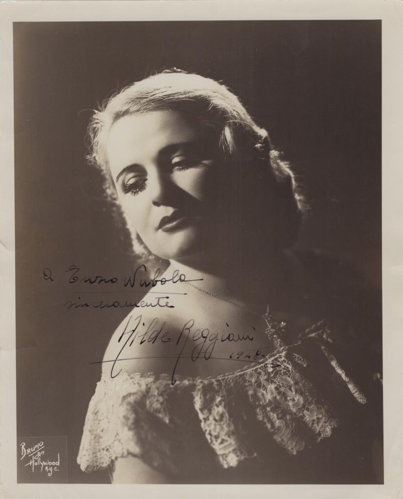 Fotografia con dedica autografa e firmata di Hilde Reggiani nota soprano lirico italiano di grande fama, attiva tra gli anni ’30 e ’50. Apprezzata per la voce calda e potente, si esibì nei maggiori teatri d’Europa e d’America, collaborando con importanti direttori e interpreti del suo tempo. La sua arte, elegante e intensa, rimane un simbolo del bel canto del Novecento. Splendida fotografia d'epoca di grandi dimensioni, realizzata dallo studio Bruno of Hollywood (New York), che ritrae la celebre cantante lirica Hilde Reggiani in un raffinato ritratto d’atmosfera. La luce morbida e l’elegante posa restituiscono tutta la grazia e la sensibilità dell’artista. Dedica autografa e firmata al centro: “A Enzo Nubola sinceramente Hilde Reggiani – 1948”