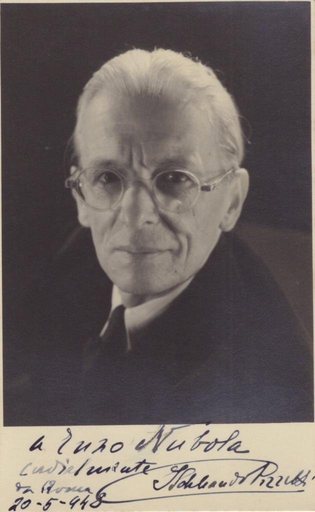 Fotografia con dedica interamente autografa e firmata di Ildebrando Pizzetti fu tra i più importanti compositori italiani del Novecento, esponente della “Generazione dell’Ottanta” insieme a Respighi, Casella e Malipiero. Autore di capolavori come Fedra, Assassinio nella cattedrale e L’oro, fu anche direttore del Conservatorio di Milano e dell’Accademia di Santa Cecilia. La sua musica, densa di lirismo e spiritualità, unisce classicità e modernità in modo unico. Straordinaria fotografia ai sali d'argento di Ildebrando Pizzetti, con dedica redatta a Parma il 20 maggio 1948. Nel 1948, Ildebrando Pizzetti era pienamente attivo come figura di spicco della vita musicale italiana. In quegli anni trascorreva periodi a Parma, dove aveva forti legami culturali e accademici con il Conservatorio “Arrigo Boito” e con l’ambiente musicale locale.