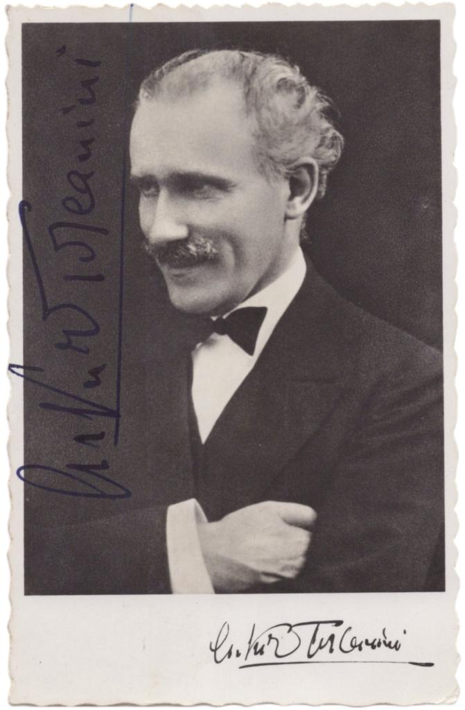 Autografo di Arturo Toscanini celebre direttore d’orchestra italiano, è considerato una delle più grandi figure della storia della musica. Direttore stabile alla Scala di Milano, al Metropolitan di New York e della NBC Symphony Orchestra, Toscanini fu interprete insuperabile di Verdi, Wagner e Beethoven. La sua carriera, lunga oltre sessant’anni, rimane simbolo di perfezione musicale e di integrità artistica. Splendida cartolina fotografica ai sali d’argento, raffigurante il celebre direttore d’orchestra Arturo Toscanini in un elegante ritratto di profilo. La cartolina riporta un autografo a stampa del Maestro in calce.