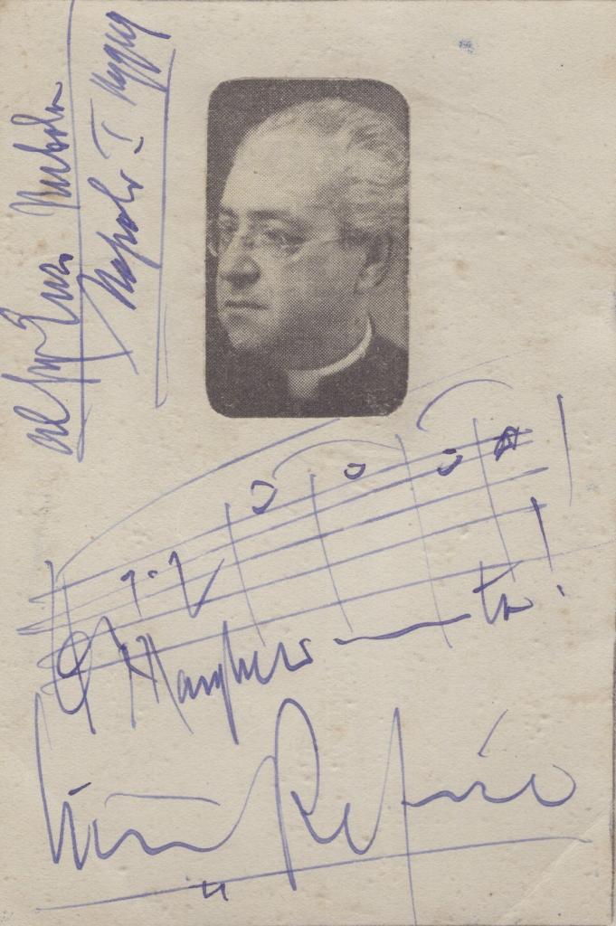 Raro e affascinante biglietto autografo di Licinio Refice celebre sacerdote, compositore e direttore di coro. Tra i principali riformatori della musica sacra nel Novecento, compose messe, oratori e opere liriche, tra cui la celebre Cecilia (1934). Collaborò con importanti istituzioni musicali italiane e la sua musica, di intensa ispirazione spirituale, rimane un punto di riferimento della tradizione corale e liturgica del XX secolo. Il documento presenta un rigo musicale interamente autografo con alcune battute scritte di suo pugno e una dedica personale firmata: “Al Sig. Enzo Nubola, Napoli 1° Maggio Licinio Refice”.