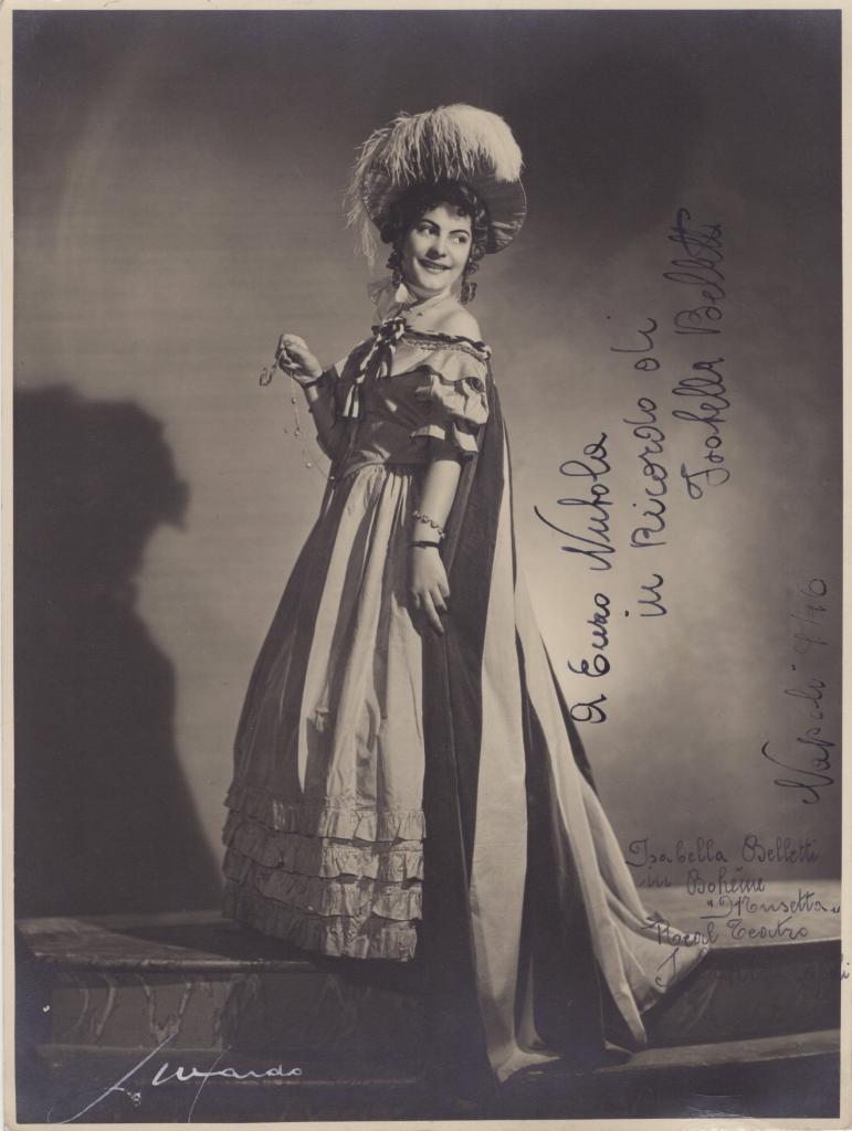 Fotografia di grandi dimensioni con dedica autografa e firmata di Isabella Bellotti, soprano italiano attivo nel dopoguerra, si esibì nei principali teatri lirici italiani, distinguendosi per l’intensità interpretativa e la finezza vocale. Tra i suoi ruoli più apprezzati: Musetta in La Bohème e Violetta ne La Traviata. Splendida fotografia ai sali d’argento realizzata dal celebre fotografo Luxardo di Roma, raffigurante il soprano Isabella Bellotti nel ruolo di Musetta ne La Bohème, rappresentata al Real Teatro di San Carlo di Napoli. Sul fronte, una dedica interamente autografa e firmata: Un ritratto di straordinaria eleganza e fascino teatrale, che immortala la cantante in costume di scena, nel pieno splendore della sua carriera. La fotografia, nitida e di grande formato, esalta la qualità luminosa e il gusto raffinato dello studio Luxardo, uno dei più importanti dell’epoca.
