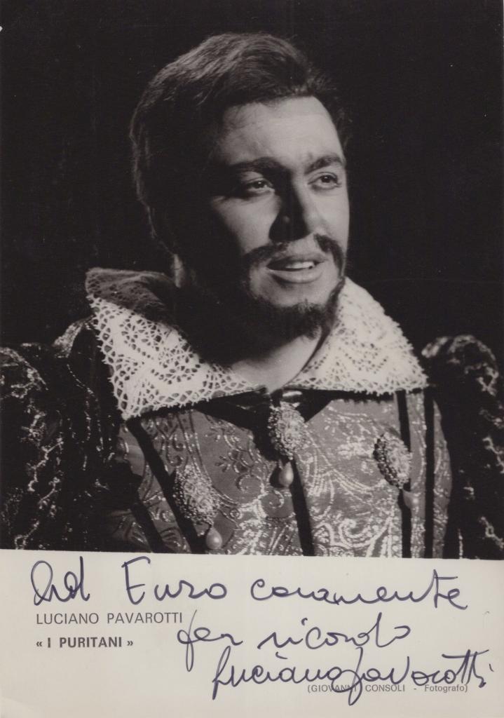 Dedica interamente autografa e firmata di Luciano Pavarotti celebre tenore italiano. Celebrato per la potenza e la purezza della sua voce, ha calcato i palcoscenici più prestigiosi del mondo, da La Scala al Metropolitan di New York. Interprete ideale del repertorio lirico italiano, da Verdi a Puccini, è ricordato anche per aver reso la lirica popolare nel mondo intero, rimanendo un’icona della musica del Novecento. Splendida fotografia ai sali d’argento del celebre fotografo Giovanni Consoli, raffigurante Luciano Pavarotti nel ruolo di Arturo Talbo ne I Puritani di Vincenzo Bellini. L’immagine, di eccezionale qualità e intensità, immortala il tenore modenese in uno dei suoi ruoli più amati e rappresentativi. Sul fronte, una lunga dedica interamente autografa e firmata: “Ad Enzo caramente per ricordo – Luciano Pavarotti”.