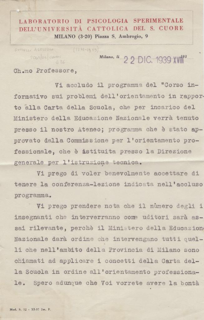 Padre Agostino Gemelli – Lettera dattiloscritta con firma autografa – Università Cattolica del Sacro Cuore, Milano – 22 dicembre 1939 Importante e rara lettera dattiloscritta su due pagine con autografo di Padre Agostino Gemelli O.F.M., francescano, medico, psicologo e fondatore dell’Università Cattolica del Sacro Cuore di Milano, figura centrale della cultura italiana e cattolica del XX secolo. La lettera, redatta su carta intestata del “Laboratorio di Psicologia Sperimentale” dell’Università Cattolica, è indirizzata al Prof. Ing. Tomassetti, direttore dell’Istituto Industriale “Carlo Grella” di Roma, ed è datata 22 dicembre 1939 (XVII E.F.). Nel testo, Padre Gemelli comunica al destinatario l’invio del programma relativo al “Corso informativo sui problemi dell’orientamento in rapporto alla Carta della Scuola”, promosso dal Ministero dell’Educazione Nazionale e approvato dalla Commissione per l’Orientamento Professionale. Tale corso, da tenersi presso l’Ateneo milanese, aveva lo scopo di aggiornare e formare il corpo docente in merito ai nuovi indirizzi pedagogici e sociali imposti dalla politica educativa del tempo. Gemelli invita ufficialmente il professor Tomassetti a tenere una conferenza-lezione all’interno del programma, precisando che l’incontro sarebbe stato frequentato da un numero particolarmente elevato di insegnanti, convocati per ordine del Ministero in quanto incaricati dell’applicazione dei principi della Carta della Scuola, documento cardine della riforma scolastica fascista. Con tono rispettoso e conciliante, Padre Gemelli chiede al collega di indicare una data utile tra il 15 gennaio e la Pasqua, preferibilmente un sabato, per facilitare la partecipazione. Specifica inoltre che, oltre al rimborso spese, sarebbe stato riconosciuto un onorario, invitandolo a comunicare liberamente le sue preferenze economiche. La lettera si conclude con la formula di cortesia: “Nella speranza e nel desiderio di essere esaudito, Vi invio i migliori saluti. Fr. Agostino Gemelli O.F.M.” Presente anche la busta d'invio su carta intestata. ChatGPT ha detto:
