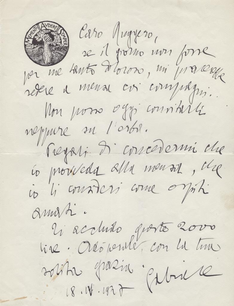 Una lettera di straordinaria intensità emotiva, che rivela il lato più intimo e generoso di d’Annunzio: il Vate che, pur nel dolore, non rinuncia alla cura per gli amici, trasformando l’assenza in un gesto di affetto e ospitalità. Il documento, di grande formato e perfettamente conservato, reca firma autografa “Gabriele” e presenta tutti gli elementi tipici della corrispondenza privata del periodo del Vittoriale degli Italiani. Lettera su carta intestata interamente autografa e firmata di Gabriele d'Annunzio celebre poeta, narratore, drammaturgo e uomo d’azione, è tra i protagonisti della cultura italiana tra Otto e Novecento. Autore de Il piacere, Le vergini delle rocce, Alcyone e dei grandi drammi, fuse estetismo e vitalismo rinnovando lingua e mito dell’artista. Nella Grande Guerra fu aviatore (volo su Vienna) e protagonista dell’impresa di Fiume. Ritiratosi al Vittoriale, continuò attività creativa e politica. Figura carismatica e controversa, ha segnato letteratura, costume e arti italiane.Straordinaria lettera di grandi dimensioni, interamente autografa e firmata da Gabriele d’Annunzio su carta intestata con il celebre motto “Memento Audere Semper”. Il Vate scrive al signor Ruggero:“Caro Ruggero, se il giorno non fosse per me tanto doloroso, mi piacerebbe sedere a mensa coi compagni. Non posso oggi convitarli neppure su l’erba. Pregali di concedermi che io provveda alla mensa, che io li consideri come ospiti amati. Ti accludo queste 2000 lire. Odo parole, con la tua solita grazia. 18.4.1927 Gabriele”. L’espressione “giorno doloroso” è probabilmente riferita a un periodo di sofferenza fisica o a uno dei frequenti episodi di malinconia che affliggevano il poeta negli anni Venti.