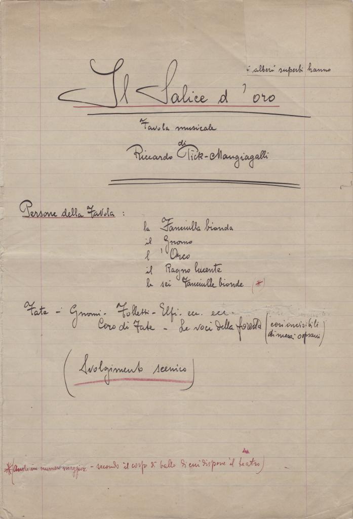 Straordinario manoscritto interamente autografo e firmato di Riccardo Pick-Mangiagalli celebre compositore, pianista e direttore, Riccardo Pick-Mangiagalli nacque a Strakonice (Boemia) e si trasferì giovanissimo a Milano, dove completò gli studi al Conservatorio sotto la guida di Michele Saladino. Dopo un’intensa attività concertistica come pianista, si dedicò alla composizione e all’insegnamento, diventando nel 1936 direttore del Conservatorio di Milano, ruolo che mantenne fino alla morte. Importante manoscritto contenente lo svolgimento scenico completo della favola musicale Il salice d’oro. Il testo, interamente vergato a mano da Pick-Mangiagalli, presenta lo svolgimento scenico, i personaggi della favola e sono presenti numerose correzioni, sottolineature, aggiunte con penna color rosso e annotazioni di lavoro, che rivelano con rara trasparenza il laboratorio creativo dell’autore. Al termine del copioso manoscritto è presente l'autografo a convalida della stesura. Opera di gusto simbolista e fantastico, Il salice d’oro intreccia elementi lirici, onirici e teatrali in una narrazione musicale di grande raffinatezza, testimonianza della poetica immaginifica di Pick-Mangiagalli e della sua centralità nel primo Novecento italiano. La Favola musicale Il salice d’oro, concepita tra gli anni Venti e Trenta, riflette l’interesse del compositore per la dimensione fiabesca e simbolista, in cui la musica assume il ruolo di linguaggio evocativo e visionario. Il salice d’oro fonde teatro, lirismo e sogno in un racconto sonoro dove il motivo naturale — l’albero che ascolta e custodisce — diventa metafora della sensibilità artistica e del potere redentore della musica. Condizioni: il manoscritto riporta difetti, pagine sciolte. Prima pagina con mancanza nell'angolo. ChatGPT ha detto: