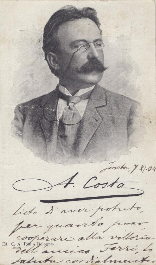 Cartolina autografa di Andrea Costa, pioniere del socialismo italiano e primo deputato socialista eletto al Parlamento Cartolina redatta a Imola il 7 novembre 1904 su supporto di propaganda elettorale.La cartolina, priva di firma ma interamente autografa, reca il testo di pugno del Costa: “Lieto di aver potuto, per quanto poco, cooperare alla vittoria dell’amico Ferri”. Sul fronte, la dicitura di propaganda: “II Collegio di Bologna – Eleggete Andrea Costa”Il riferimento è alla vittoria elettorale di Giacomo Ferri, esponente socialista bolognese, sostenuto da Costa durante la campagna per le elezioni politiche del 1904. Il documento riflette il clima di entusiasmo e solidarietà interna al movimento socialista di inizio Novecento, di cui Costa fu figura guida e simbolo.