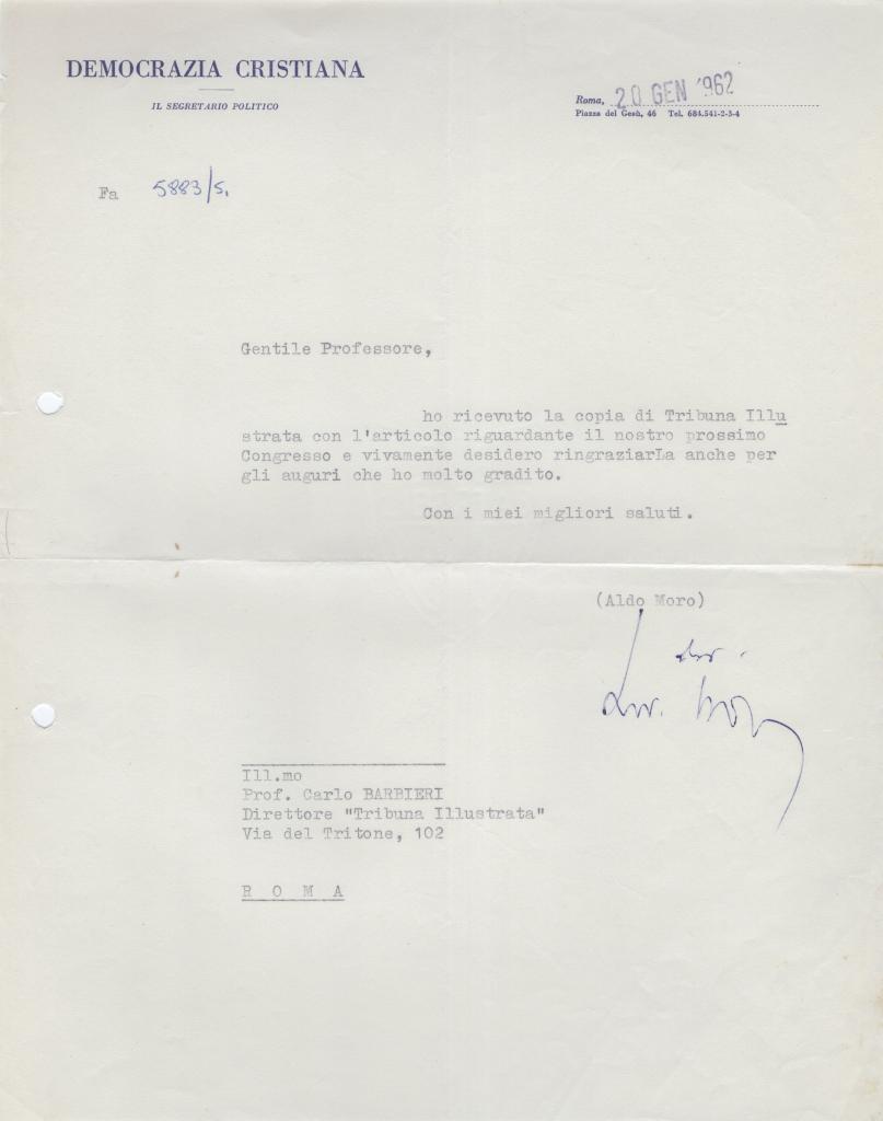 Lettera dattiloscritta con autografo di Aldo Moro celebre esponente di spicco della Democrazia Cristiana, fu cinque volte Presidente del Consiglio e più volte Ministro degli Esteri, della Pubblica Istruzione e della Giustizia. Fu protagonista della "strategia dell'attenzione" verso il Partito Comunista negli anni '70. Il suo tragico rapimento e assassinio da parte delle Brigate Rosse nel 1978 segna uno dei momenti più drammatici della storia della Repubblica Italiana.Redatta su carta intestata del Segretario Politico della Democrazia Cristiana e datata 20 gennaio 1962, la missiva è indirizzata al Prof. Carlo Barbieri, direttore della Tribuna Illustrata.Nel testo, Moro esprime profonda gratitudine per la copia di Tribuna Illustrata ricevuta con l'articolo riguardante il prossimo Congresso del partito. Documento rappresentativo del periodo in cui Moro guidava la Democrazia Cristiana verso una fase di dialogo e rinnovamento, preludio alla celebre “strategia dell’attenzione” verso il Partito Comunista.