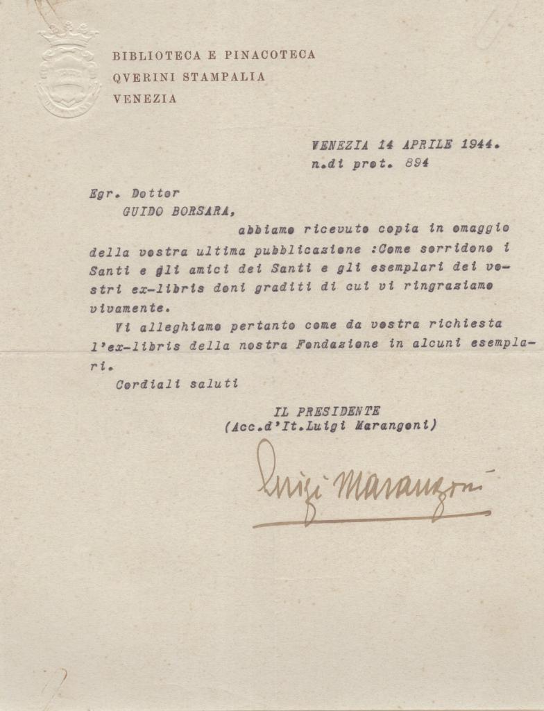 Lettera dattiloscritta con autografo di Luigi Marangoni, celebre storico dell’arte e presidente della Biblioteca e Pinacoteca Querini Stampalia di Venezia. Il documento, redatto su carta intestata ufficiale della Fondazione Querini Stampalia e datato 14 aprile 1944, è indirizzato al Dott. Guido Borsara.