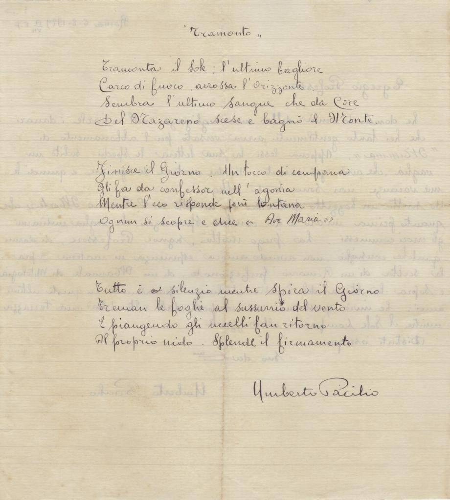Scritti autografi di Umberto Pacilio fu poeta, scrittore e drammaturgo italiano attivo tra gli anni Venti e Trenta. Figura di raffinata sensibilità letteraria, coltivò la poesia di ispirazione romantica e spirituale e si dedicò alla scrittura teatrale, affrontando temi patriottici e morali. Collaborò con ambienti culturali e accademici, distinguendosi per uno stile limpido e riflessivo. Documento interamente autografo e firmato di Umberto Pacilio, composto da un foglio scritto fronte e retro, contenente una lettera e una poesia dal titolo “Tramonto”, entrambe manoscritte e firmate, datate Roma, 6 agosto 1929 e indirizzate ad un Professore non specificato. Nella lettera, Pacilio si scusa per un ritardo epistolare e comunica di aver scritto un bozzetto patriottico in un atto intitolato “O Roma o morte”, che intende inviare al destinatario perché lo esamini e ne corregga gli eventuali errori. Sul retro del foglio è riportata la poesia “Tramonto”, in cui l’autore descrive la fine del giorno come simbolo di pace e meditazione spirituale, mostrando un profondo senso lirico e religioso.
