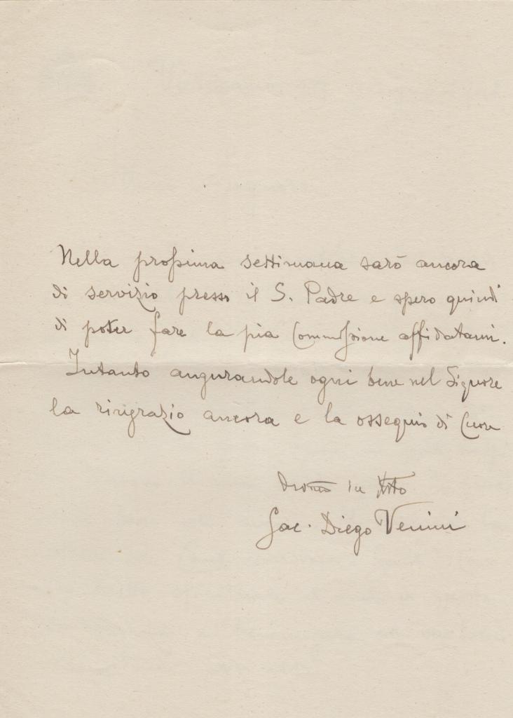 Lettera interamente autografa e firmata di Diego Venini, Arcivescovo e diplomatico vaticano, figura di rilievo della Curia durante i pontificati di Pio XI e Pio XII. Collaboratore della Segreteria di Stato, si distinse per cultura, sensibilità pastorale e impegno nella promozione della letteratura religiosa. Morì nel 1956. Lettera redatta dal Vaticano il 19 giugno 1941 e presumibilmente indirizzata al Prof. Guido Borsara. Nel testo, Venini ringrazia sentitamente per il dono ricevuto e comunica di aver iniziato la lettura dell’opera “Come sorridono i Santi”, dalla quale dichiara di trarre “vero diletto spirituale”. Con tono rispettoso e riconoscente, informa poi il destinatario che sarà al servizio presso il Santo Padre, esprimendo la speranza di portare a termine la commissione affidatagli.ChatGPT ha detto: