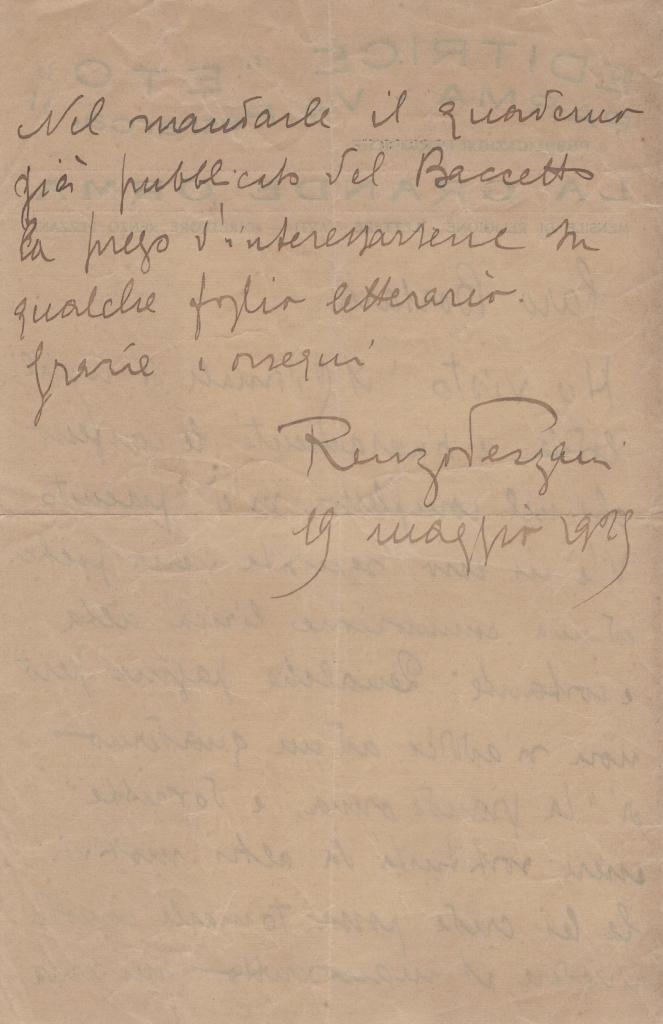 Lettera interamente autografa e firmata di Renzo Vezzani celebre scrittore, critico ed editore parmense, Renzo Vezzani fu una figura attiva nella vita culturale italiana del Novecento. Fondatore dell’Editrice Edo di Parma, promosse opere di narrativa, poesia e critica letteraria, collaborando con numerosi autori emergenti. La sua attività contribuì alla diffusione della cultura letteraria emiliana tra le due guerre. Lettera redatta su carta intestata dell’Editrice Edo di Parma e indirizzata allo scrittore Guido Borsara. Nella missiva, datata 19 maggio 1929, Vezzani commenta con franchezza la lettura de “Il giornale di un’allodola”: dichiara di averlo apprezzato per stile e contenuto, pur trovando “qualche pagina non del tutto adatta a un quaderno di ‘La grande orma’”.