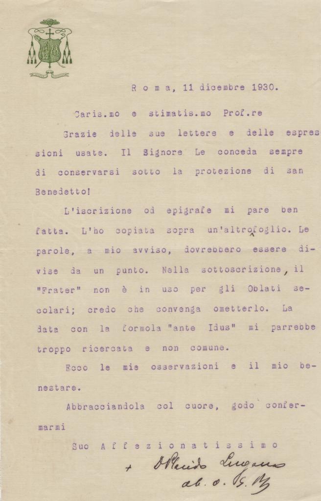 Lettera dattiloscritta con autografo di Placido Lugano, monaco benedettino, teologo e letterato, Placido Lugano fu una delle figure più colte del monachesimo italiano del Novecento. Membro degli Oblati di San Benedetto, insegnò teologia e filologia cristiana, distinguendosi per la finezza del pensiero e la padronanza del latino ecclesiastico. Fu vescovo e studioso apprezzato per la sua attività pastorale e il suo contributo alla cultura cattolica. Lettera redatta su carta intestata personale con stemma episcopale e indirizzata a un professore non specificato. Nella missiva, datata Roma, 11 dicembre 1930, Lugano ringrazia il destinatario per le cortesi parole e offre alcune osservazioni di natura linguistica e stilistica su un’iscrizione o epigrafe, suggerendo modifiche nella forma e nella terminologia secondo gli Oblati. Mostra così il suo caratteristico equilibrio tra rigore dottrinale e finezza culturale, riflesso della sua formazione benedettina. Invia inoltre una benedizione sotto la protezione di San Benedetto.