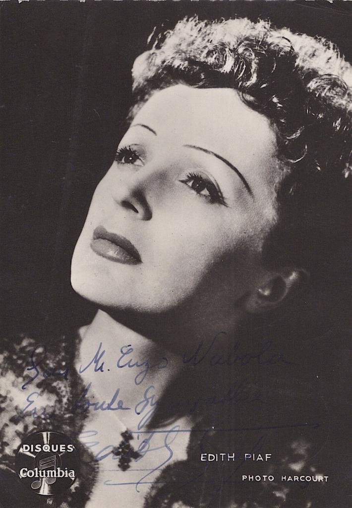 Rarissima cartolina promozionale con dedica interamente autografa di Édith Piaf, nacque in povertà e trovò nella musica la sua salvezza. Scoperta giovanissima, divenne celebre per la voce intensa e drammatica e per brani iconici come La vie en rose e Non, je ne regrette rien. Amori tumultuosi e una vita segnata dal dolore contribuirono al suo mito eterno. Splendida cartolina promozionale ai sali d'argento marcata Disques Columbia con iconica fotografia Photo Harcourt della leggendaria Édith Piaf, uno dei volti più amati e riconoscibili della chanson française. La cartolina presenta una preziosa dedica interamente autografa, vergata con elegante tratto blu e indirizzata al sig. Nubola. Un pezzo straordinario, evocativo e poetico, che racchiude tutta l’intensità dello sguardo e dell’arte dell’“Usignolo di Francia”.