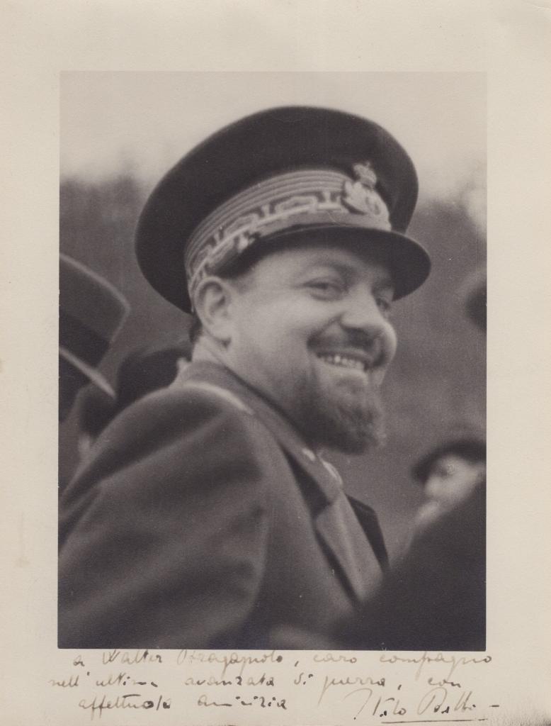 Magnifica fotografia ai sali d’argento con dedica autografa e firma di Italo Balbo celebre aviatore, militare e uomo politico italiano. Eroe della Grande Guerra, divenne tra i principali promotori dell’Aeronautica fascista, celebre per le trasvolate oceaniche. Governatore della Libia dal 1934, morì abbattuto per errore dalla contraerea italiana a Tobruch. Fotografia ai sali d’argento raffigurante Italo Balbo di profilo in abiti militari, impreziosita da una dedica interamente autografa e firmata dall’allora giovane ufficiale, destinata a Walter Bragagnolo del 3° Reggimento Alpini, Battaglione Exilles. Bragagnolo, compagno d’armi di Balbo durante la Grande Guerra, servì sul fronte del Monte Nero – Monte Rosso nel 1915, partecipò alla Strafexpedition, operò a lungo sulla Fronte Trentina (Pasubio) e, negli ultimi mesi del conflitto, fu schierato nella zona del Monte Grappa, trovandosi infine a Feltre al momento dell’Armistizio. In seguito divenne segretario del Fascio di Biella. Nella dedica – di grande forza evocativa – Balbo lo ricorda con parole di sincero trasporto: Documento di eccezionale fascino, testimonianza diretta dei legami e delle memorie nate nelle trincee della Prima Guerra Mondiale tra due giovani soldati destinati a percorsi profondamente diversi.