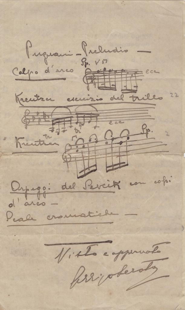 Programma di studio dal titolo “Colpo d’arco” con righi musicali manoscritti del violinista Arrigo Serato, allievo di Eugène Ysaye, unì virtuosismo e grande finezza interpretativa, esibendosi nelle principali sale europee. Apprezzato didatta, insegnò al Conservatorio di Roma formando intere generazioni di violinisti. Figura di rilievo della scuola violinistica italiana, è ricordato per stile elegante, suono raffinato e competenza tecnica fuori dal comune. Si tratta di un programma di studio interamente redatto di suo pugno, dedicato al tema del “colpo d’arco”, con annotazioni tecniche di grande precisione relative a scale, esercizi progressivi, arpeggi, passi di repertorio e indicazioni sull’impostazione e la dinamica dell’arco. Il foglio, intestato “Arrigo Serato – Privat-Sekretariat”, mostra una fitta serie di note didattiche, nelle quali Serato organizza un percorso metodico che comprende scale legate e picchiettate, passaggi a intervalli, studi d’ottava e approfondimenti sulle difficoltà tecniche più ricorrenti. Di particolare pregio sono i righi musicali manoscritti presenti nella parte destra del documento, dove il maestro traccia esempi tecnici, richiami a Rodolphe Kreutzer e Gaetano Pugnani ed esercizi destinati a perfezionare la precisione dell’arco, il tutto riportato con grafia musicale vivida e raffinata. A completare il documento, in basso compare l’indicazione “Visto e approvato – Arrigo Serato”, firmata di suo pugno, che attesta l’uso didattico diretto del materiale.