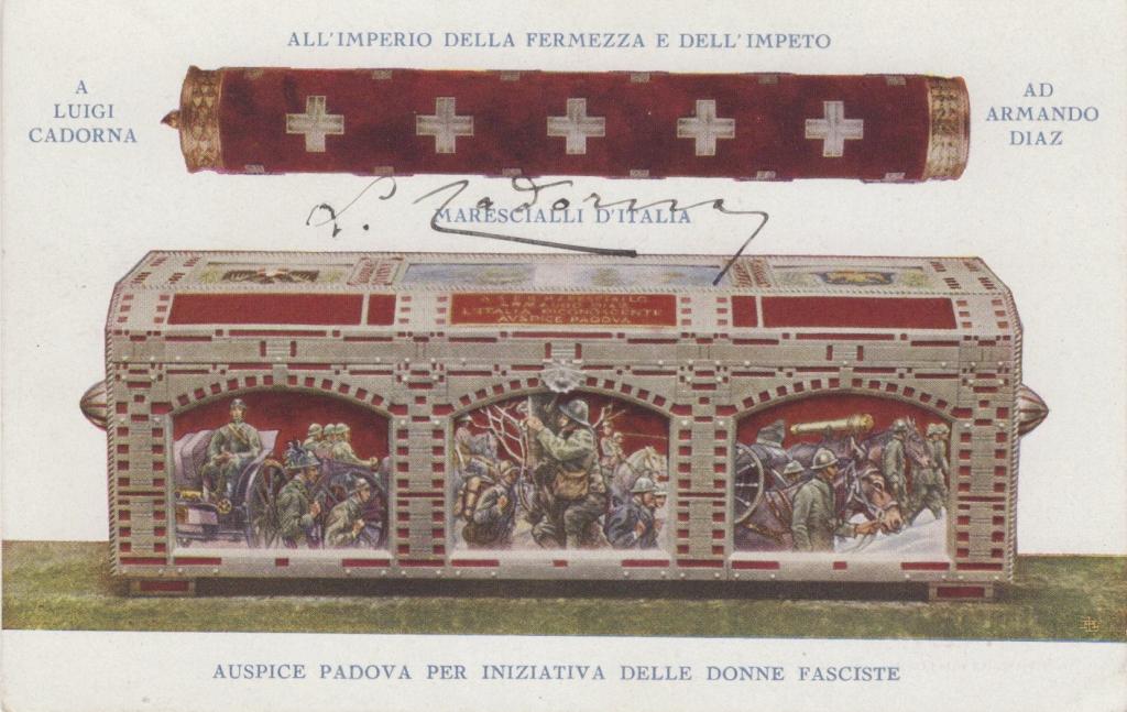 Cartolina commemorativa del 14 giugno 1925 con autografo di Luigi Cadorna celebre generale e Capo di Stato Maggiore dell’Esercito nella Prima Guerra Mondiale, guidò le operazioni sull’Isonzo fino alla disfatta di Caporetto (1917). Criticato per la durezza dei suoi metodi, fu nominato Maresciallo d’Italia nel 1924. Cartolina storica di grande fascino, dedicata ai Marescialli d’Italia Luigi Cadorna e Armando Diaz, impreziosita dalla firma di Luigi Cadorna al cento. L’immagine raffigura un cofano decorato con scene militari e il vessillo onorifico destinato alle due più alte figure dell’Esercito italiano nella Grande Guerra. L’iniziativa, promossa dalle Donne Fasciste di Padova, testimonia l’intento celebrativo e retorico del periodo. La cartolina presenta un ricco apparato iconografico: sulle superfici del cofano sono raffigurati artiglieri, soldati in avanzata e scene di trincea, simbolo dell’immaginario eroico legato al Primo Conflitto Mondiale.