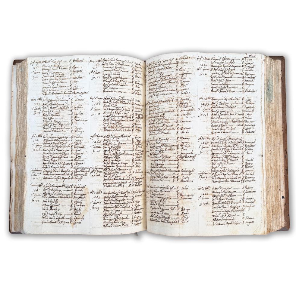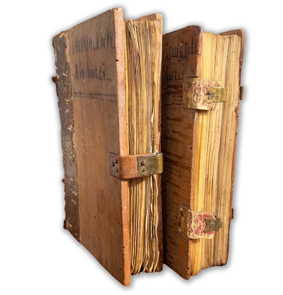 Straordinario complesso documentario senese del pieno Cinquecento, costituito da due tomi gemelli redatti negli anni 1560 e 1561, nel pontificato di Paolo IV e sotto l’autorità imperiale di Carlo V. Si tratta di un protocollo notarile organico, completo di indici manoscritti coevi, numerazione antica delle carte e fascicolazione originaria, conservato nelle sue legature cinquecentesche in assi lignee con dorso in pelle e tracce di fermagli metallici. Sul piatto compare il titolo manoscritto antico “Istrumenti di Binducci”, chiara indicazione della destinazione archivistica familiare.
