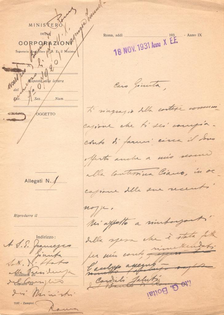 Segue la risposta autografa di Giuseppe Bottai, datata 18 novembre 1931, su carta intestata del Ministero delle Corporazioni. Bottai ringrazia Giunta per la comunicazione relativa all’offerta fatta anche a suo nome alla contessina Ciano in occasione delle recenti nozze e precisa che provvederà a rimborsare la somma spettante, comunicando l’invio dell’assegno.