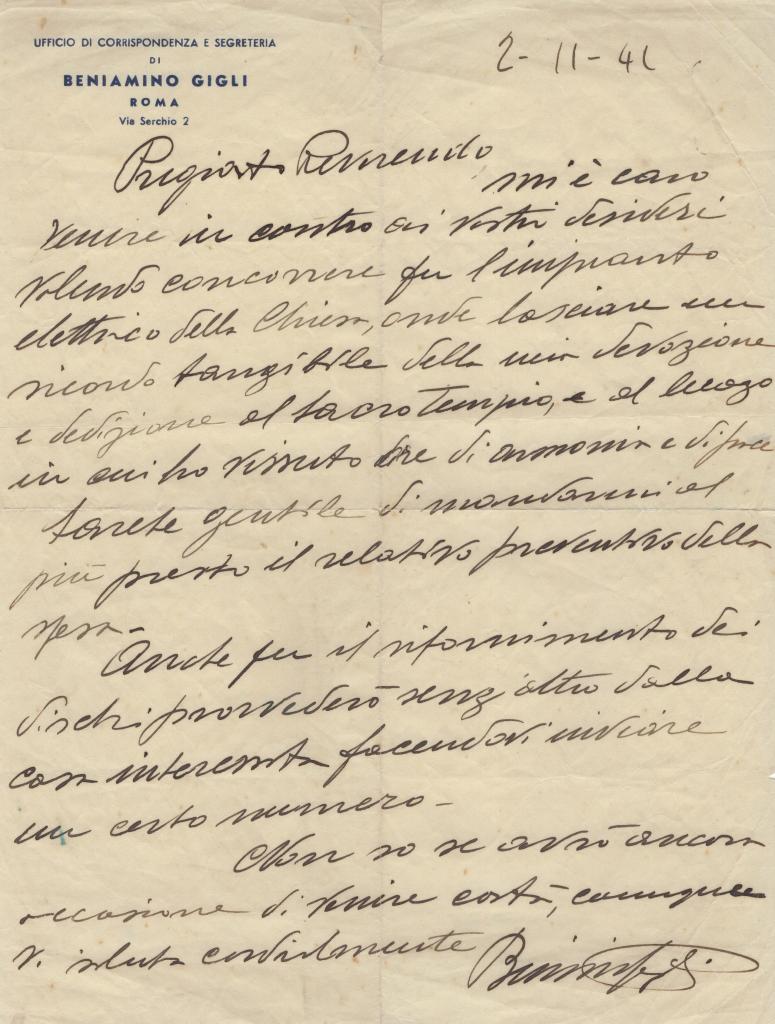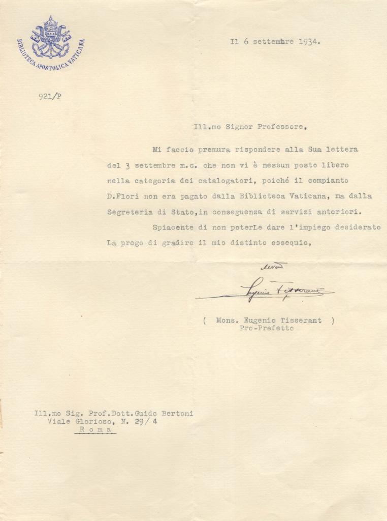 Il documento è indirizzato all’Ill.mo Prof. Dott. Guido Bertoni e costituisce risposta a una precedente richiesta relativa alla possibilità di ottenere un impiego presso la Biblioteca Vaticana nella categoria dei catalogatori. Mons. Tisserant comunica con tono formale che non vi è alcun posto disponibile, spiegando che il precedente collaboratore, D. Flori, non era retribuito dalla Biblioteca stessa ma dalla Segreteria di Stato in virtù di servizi precedentemente prestati. Conclude la missiva esprimendo rammarico per l’impossibilità di concedere l’impiego richiesto.