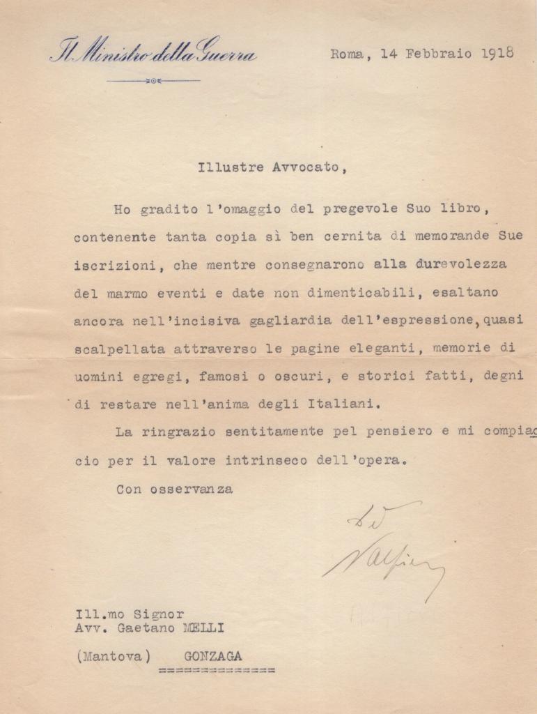 Lettera dattiloscritta con autografo di Vittorio Luigi Alfieri su carta intestata “Il Ministro della Guerra”, datata Roma, 14 febbraio 1918, indirizzata all’Ill.mo Avv. Gaetano Melli di Gonzaga (Mantova).