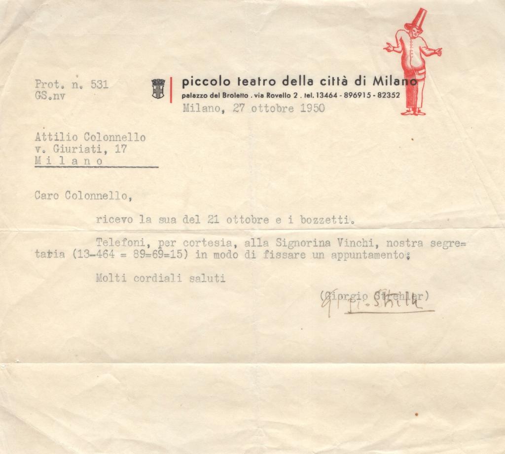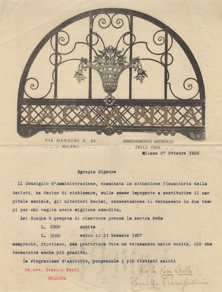 Lettera dattiloscritta firmata da Camillo Prampolini, su carta intestata illustrata “La Casa Bella – Arredamento artistico della casa”, con elegante vignetta decorativa, recante indirizzo Via Manzoni 23, Milano, datata 27 ottobre 1926.