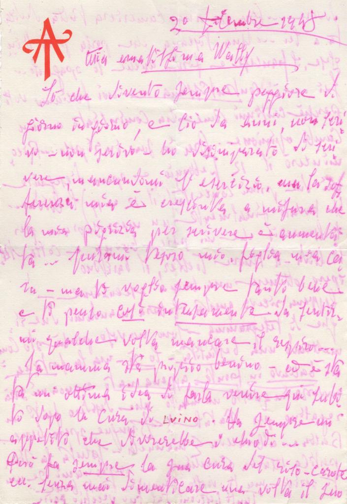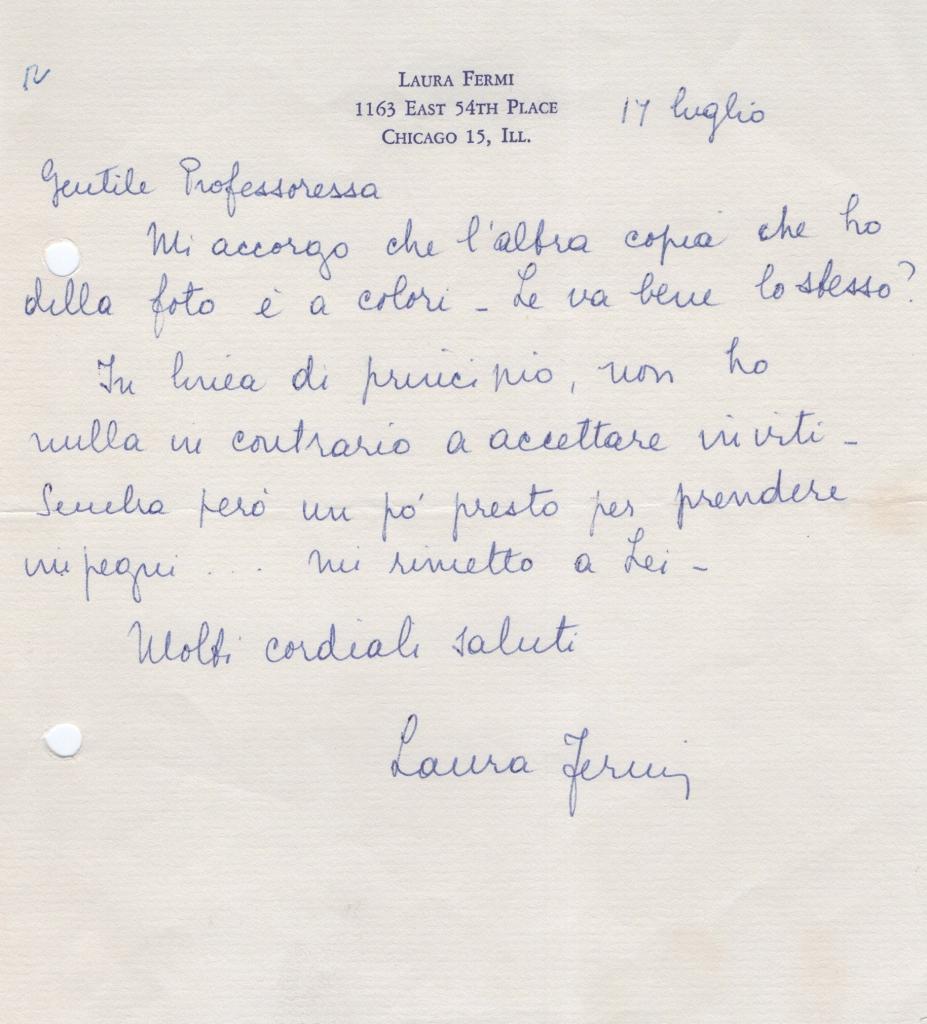 Lettera interamente autografa di Laura Fermi, su carta intestata, recante l’indirizzo americano “1163 East 54th Place, Chicago 15, Ill.”, datata 17 luglio.