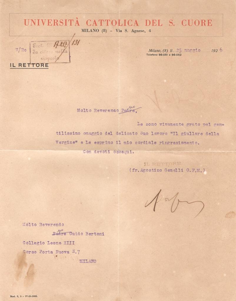 Lettera dattiloscritta firmata da frate Agostino Gemelli su carta intestata “Università Cattolica del Sacro Cuore – Milano, Via S. Agnese 4”, datata 25 maggio 1926, con indicazione del mittente “Il Rettore”. Il documento presenta protocolli e annotazioni manoscritte d’ufficio in alto a sinistra.