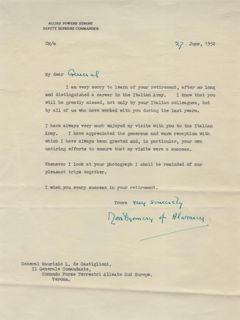 Lettera dattiloscritta con autografo di Bernard Montgomery, Vice Comandante Supremo, su carta intestata “Allied Powers Europe – Deputy Supreme Commander”, datata 27 giugno 1952, indirizzata al Generale Maurizio L. de Castiglioni, Comandante delle Forze Terrestri Alleate Sud Europa.
